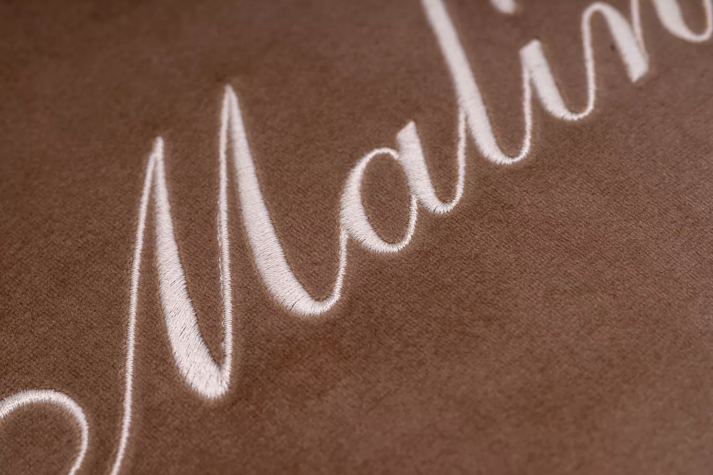 – alapanyag típusa, színe: 100% poliészter, bársony (anyagában fényes, minta nélküli), sötétebb homokszín. Minőség: I. osztály