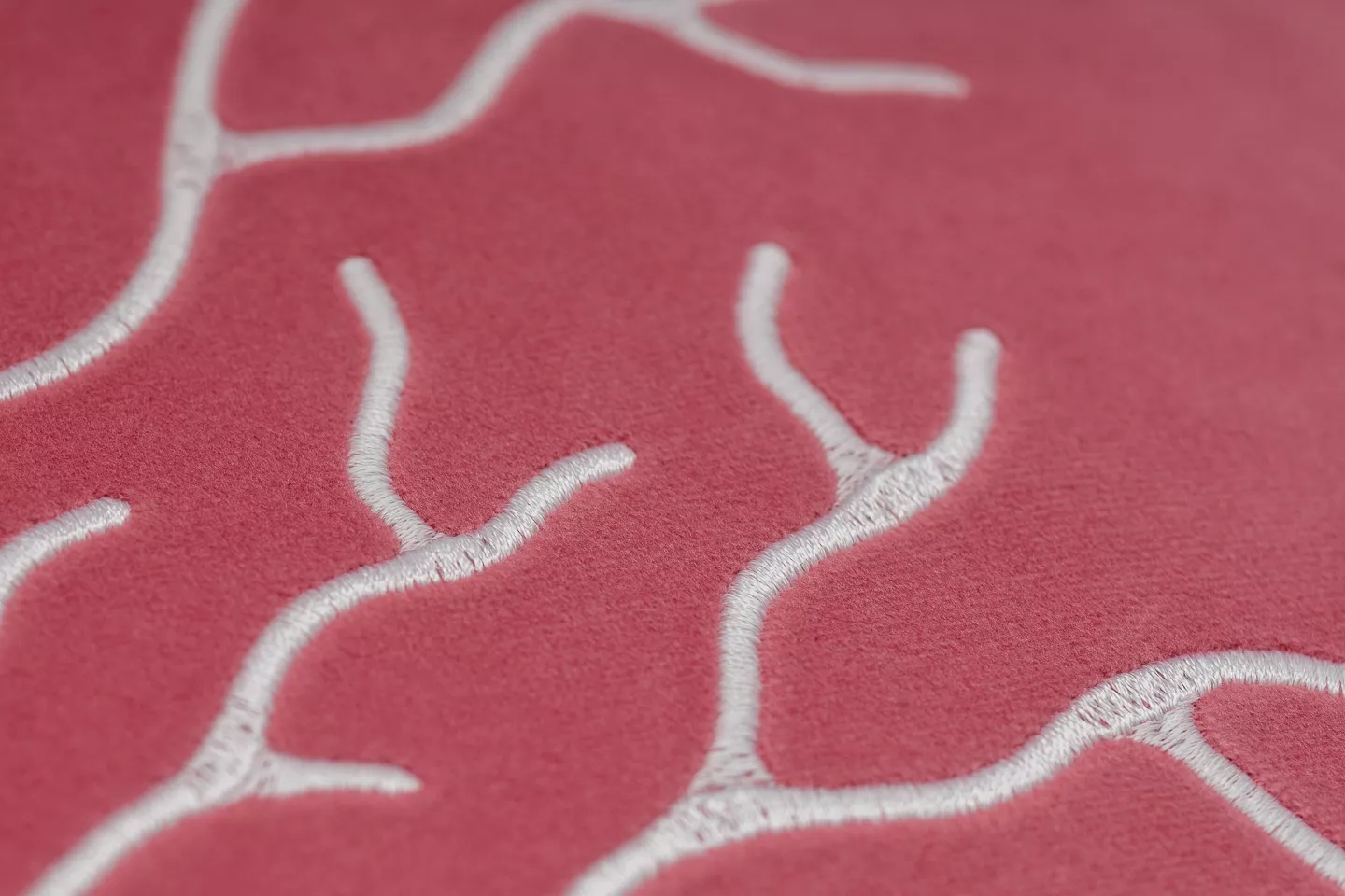 – alapanyag típusa, színe: 100% poliészter, bársony (anyagában fényes, minta nélküli), korall. Minőség: I. osztály. A díszpárnahuzat a szélein az alapanyagával megegyező, elegáns peremezéssel van ellátva.